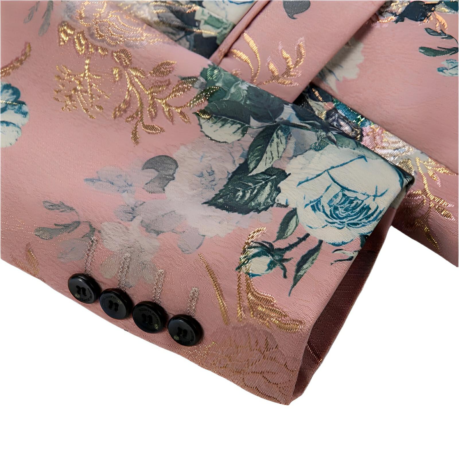 This sophisticated blazer features a rich fabric adorned with jacquard floral detailing, creating a striking visual contrast. The blazer has a tailored fit, with a sleek lapel that complements its luxurious silhouette. Ideal for formal or fashion-forward events, this statement piece combines traditional tailoring with bold styling for a memorable finish. Be unforgettable.