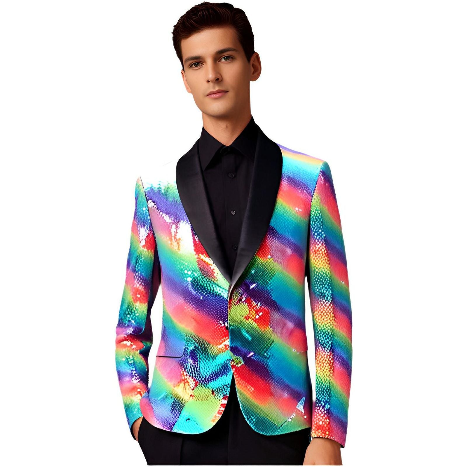 This striking blazer features a rich fabric adorned with brilliant sequin crystals, creating a stunning rainbow effect. The blazer has a tailored fit, with a satin lapel that complements its luxurious detailing. Ideal for formal or fashion-forward events, this statement piece combines traditional tailoring with bold, artistic flair. Own the moment.