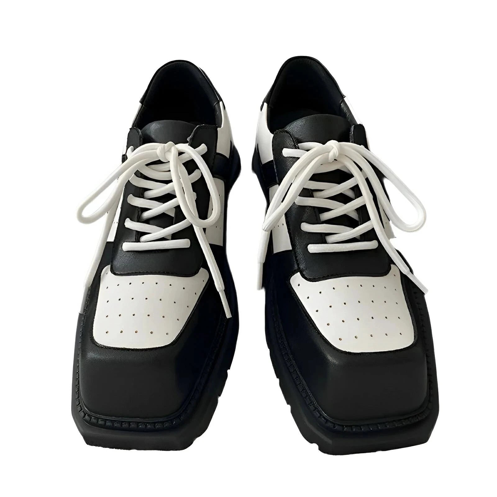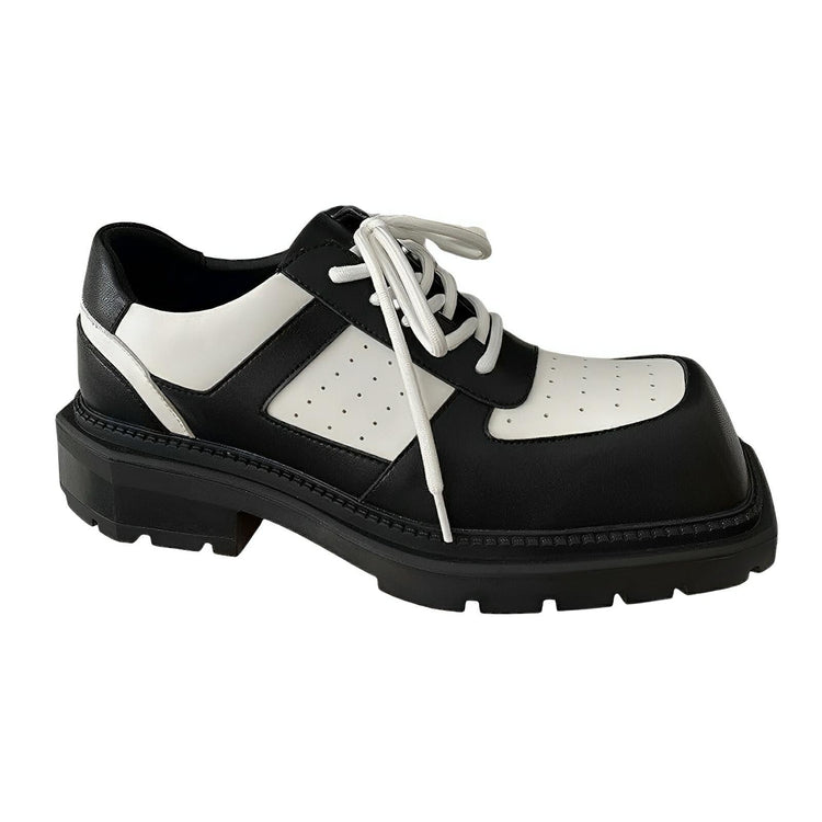 This striking pair of platform oxfords feature a modern, chunky sole for added height and grip, complemented by color-block detailing across the upper. The square toe and smooth finish give it a polished look, making these shoes suitable for both casual and semi-formal occasions. Their comfortable fit and contemporary aesthetic make them a versatile addition to any wardrobe. Step into confidence.