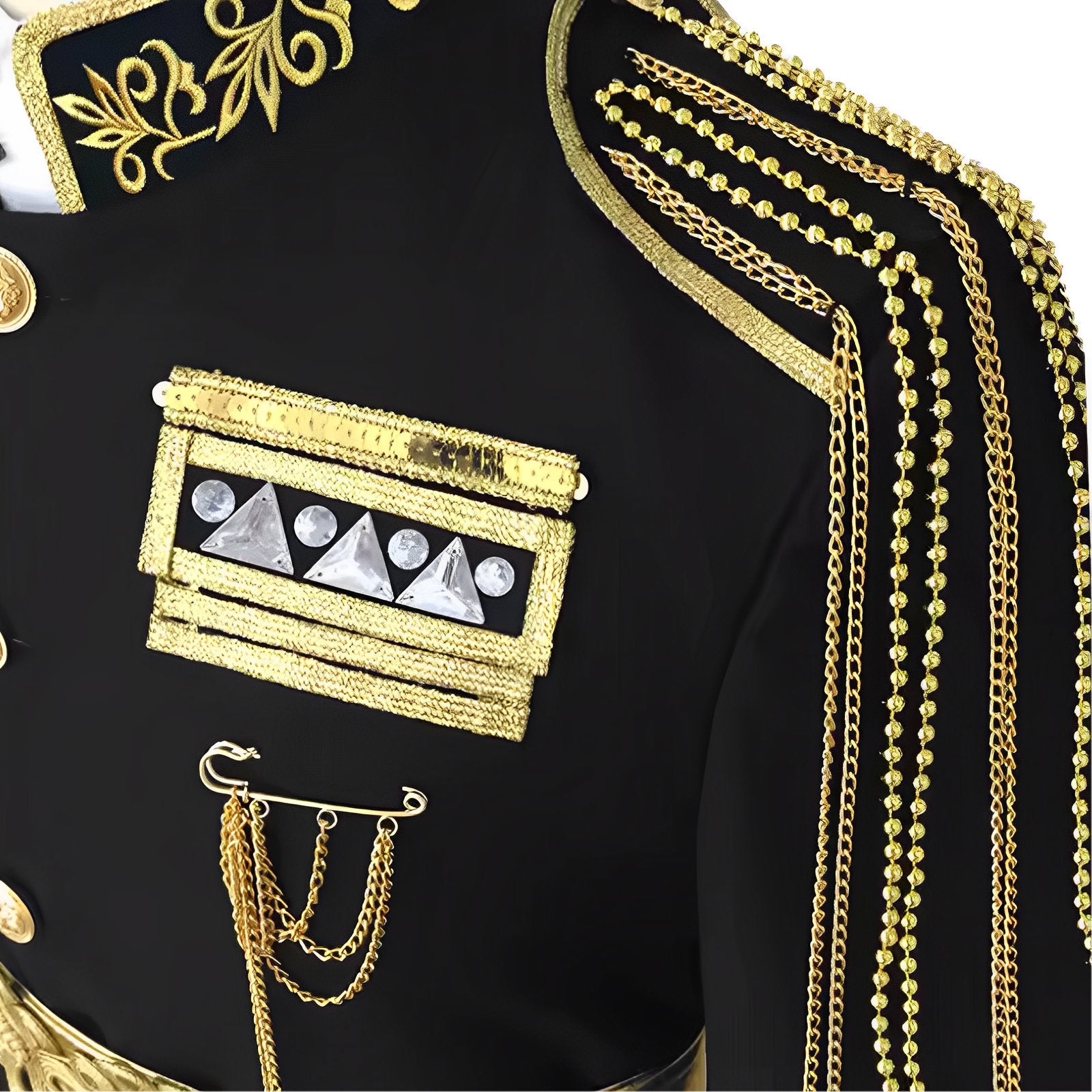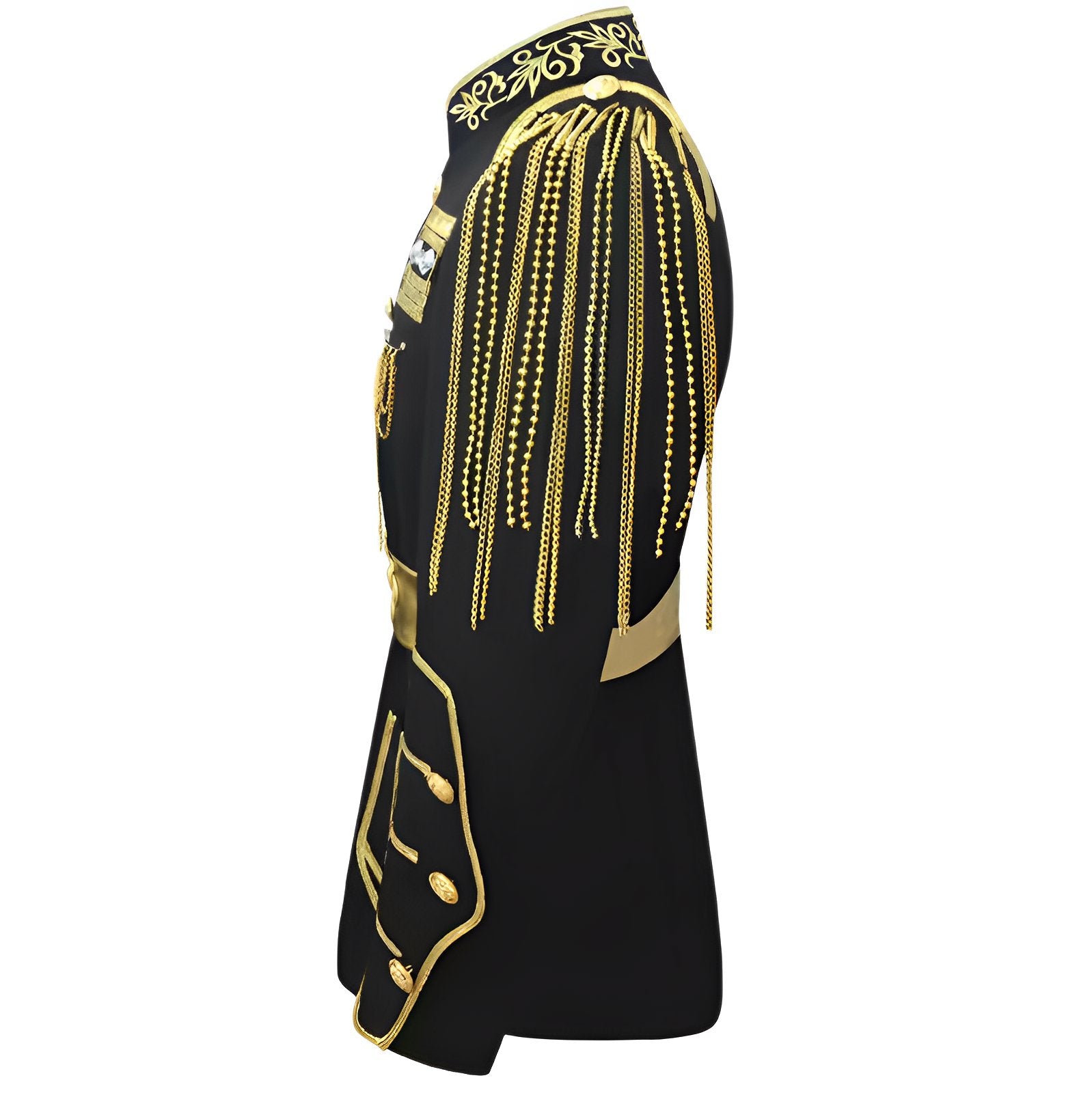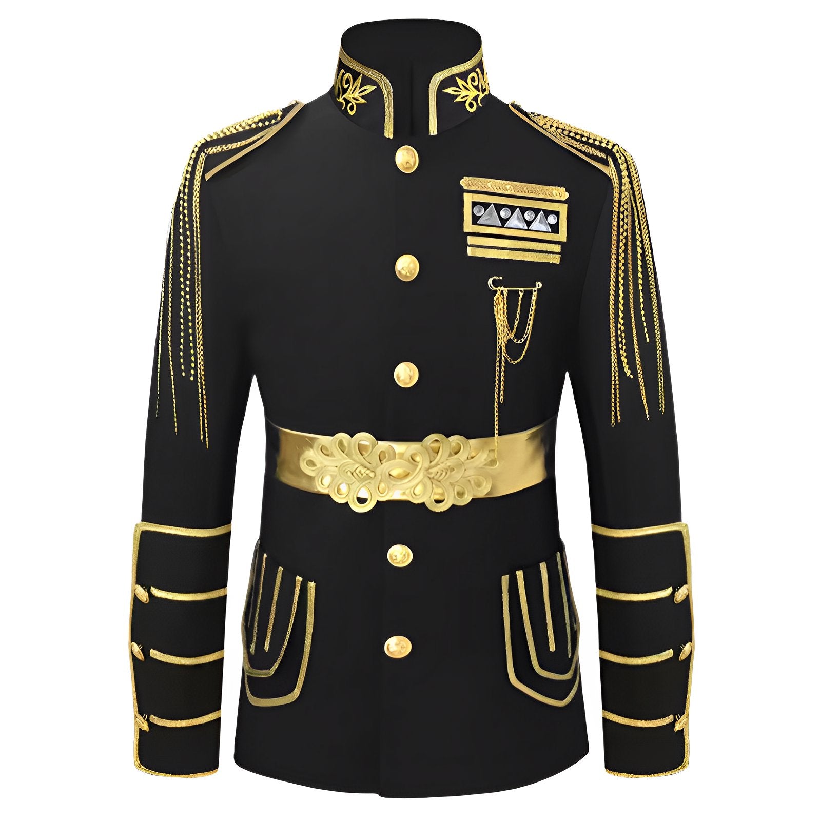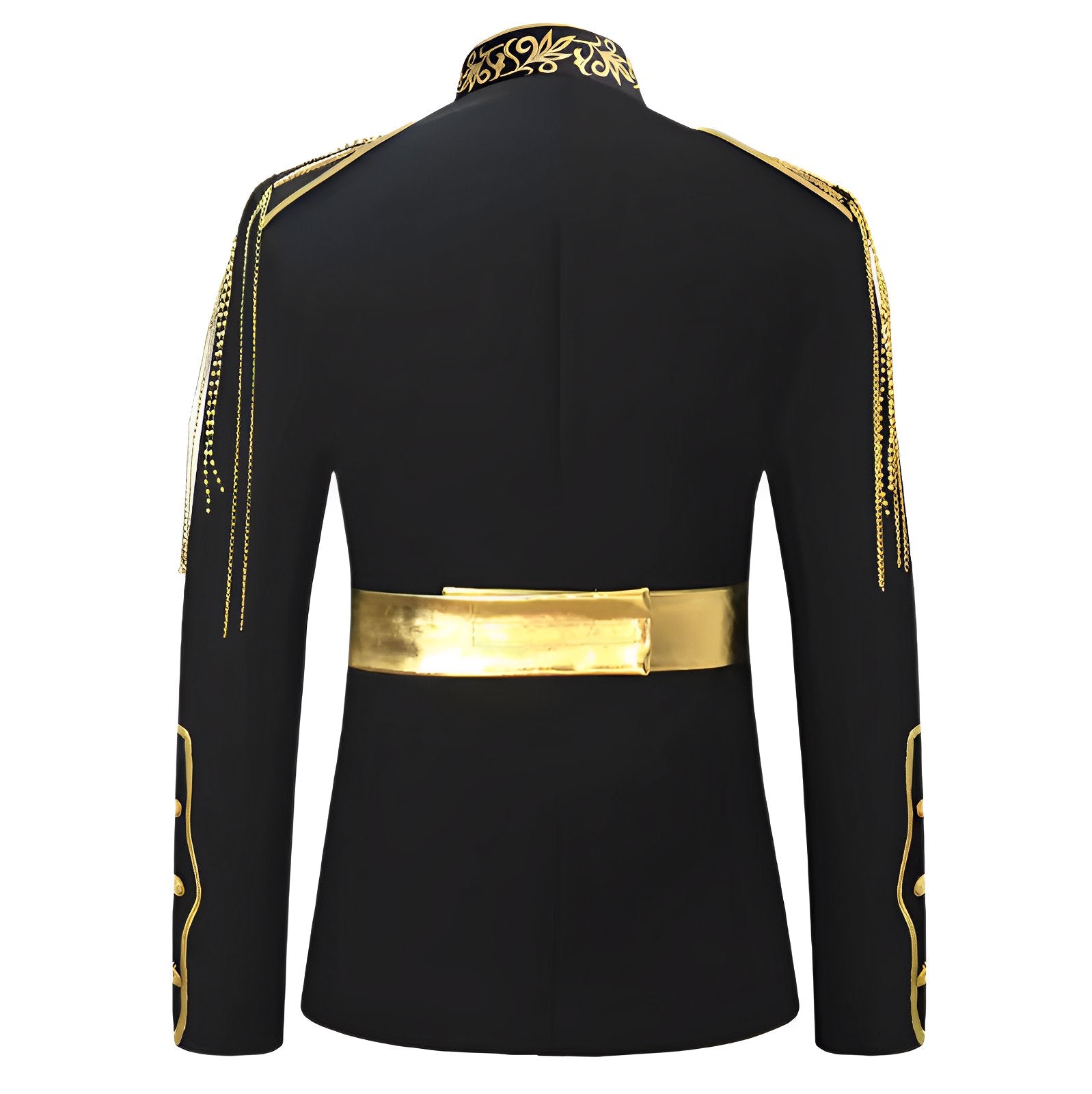 This military-inspired blazer features ornate, gold tassels that run luxuriously along the shoulders, creating a dynamic visual effect. It has a refined high-collar, and an accent waist belt that enhance its captivating appearance. The tailored fit, and opulent design make this jacket perfect for both formal and festive occasions. Command attention.