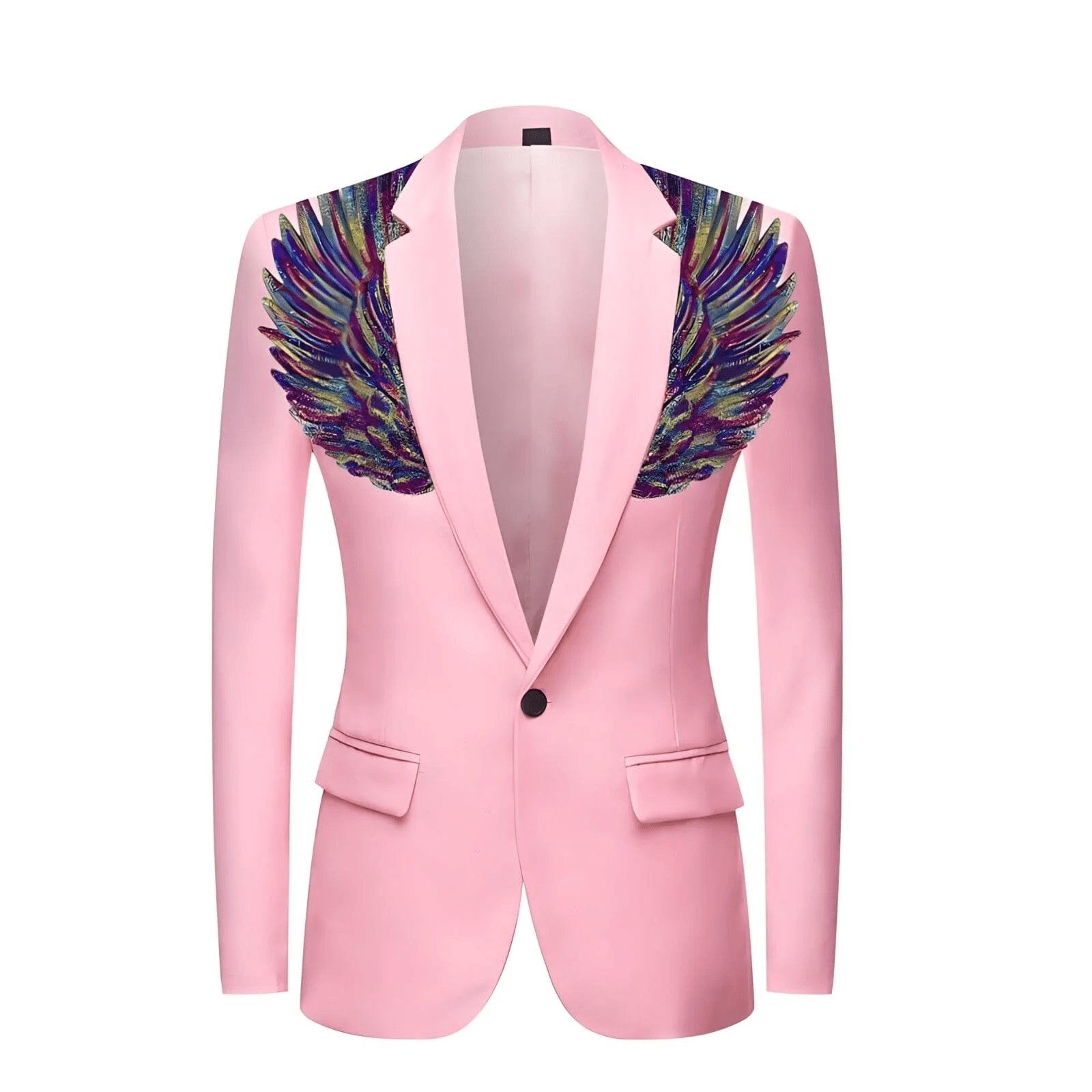 This striking blazer features a rich fabric adorned with metallic wing appliqués, creating a stunning visual contrast. The blazer has a tailored fit, with a sleek lapel that complements its luxurious detailing. Ideal for formal or fashion-forward events, this statement piece combines traditional tailoring with bold, artistic flair. Own the room.
