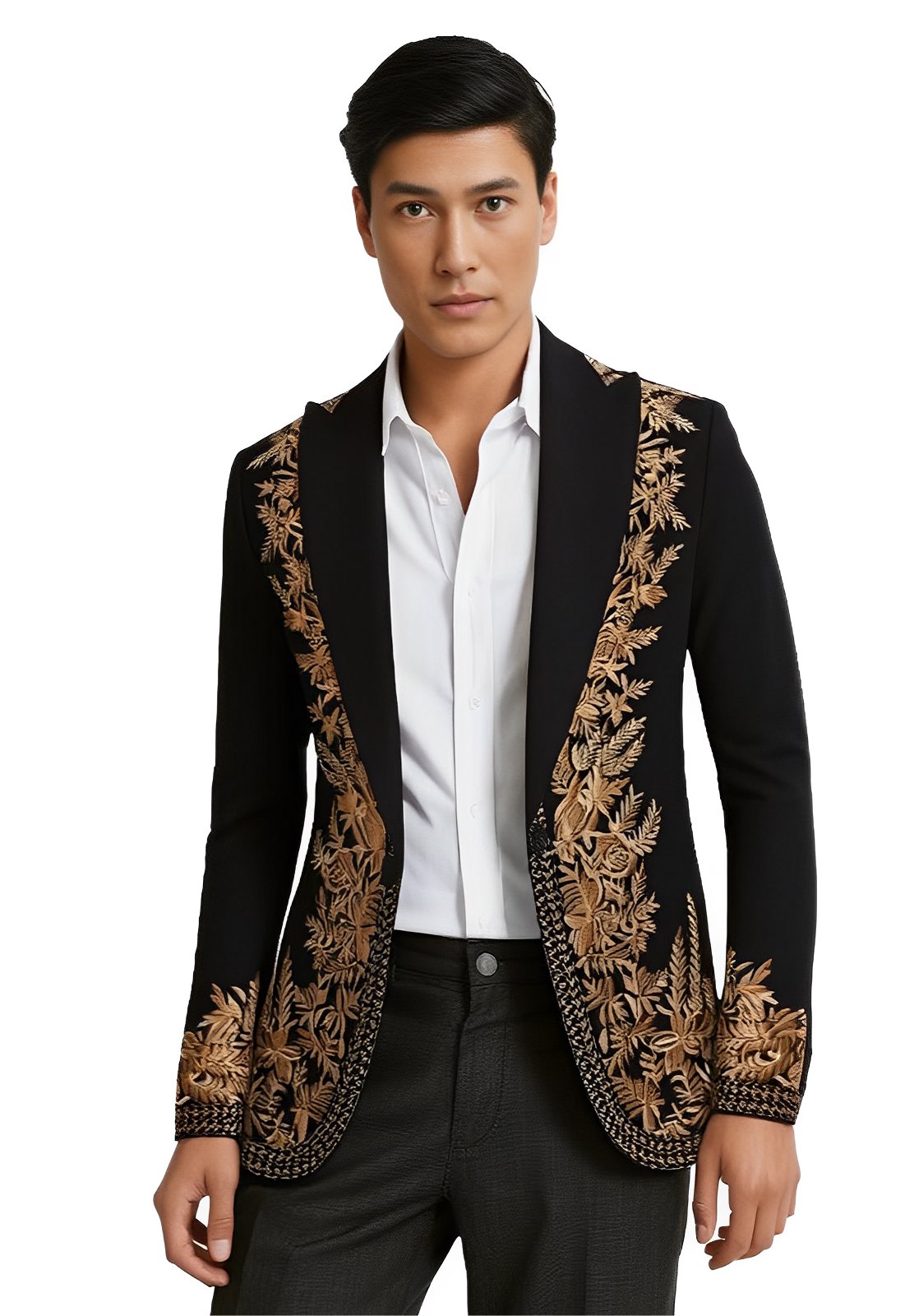 This exquisite blazer features a rich velvet fabric adorned with intricate floral embroidery, creating a striking visual contrast. The blazer has a tailored fit, with a sharp lapel that complements its luxurious detailing. Ideal for formal or fashion-forward events, this statement piece combines traditional tailoring with bold, opulent flair. Be unforgettable.