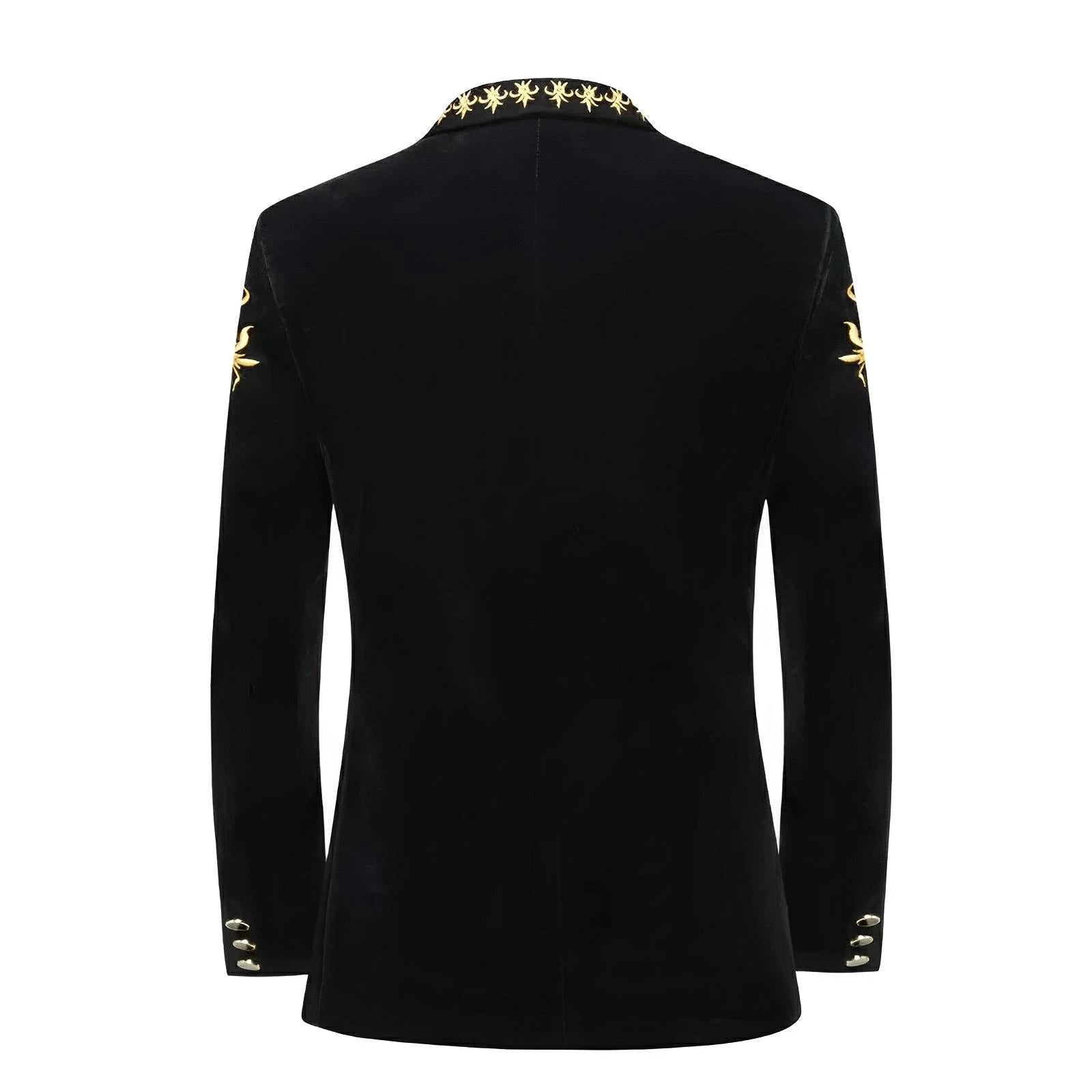 This elegant blazer features a rich velvet fabric adorned with intricate gold embroidery, creating a striking visual contrast. The blazer has a tailored fit, with a sleek lapel that complements its luxurious detailing. Ideal for formal or fashion-forward events, this statement piece combines traditional tailoring with bold, artistic flair. Be remembered.